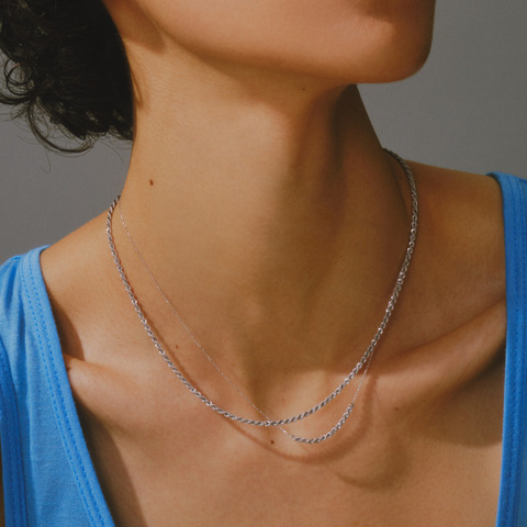 繊細に輝くチェーンの中心にモダンなシェイプをセッティングし、からだの中心である鎖骨部分に地金のパワーを宿らせました。