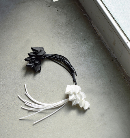 パーツ1枚ごとにプリーツ加工や、素材の特性を活かしながら、変化を持たせています。一見単色に見えますが、何色かに染め分けを行い組み合わせることで、色味に奥深さを出しています。パリッとした固さのある素材で美しいフォルムをキープします。
