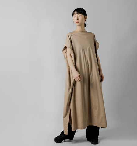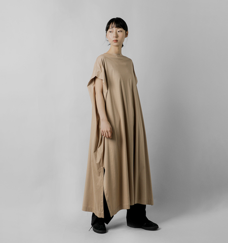直線的なストレートボディに、内側へ折り込まれたアームホールが印象的なドレス。両脇には深めのスリットを入れ、軽やかな抜け感をプラスしています。背中心に施された深いボックスタックと、内側に巻き込まれたアームラインの構造が、たっぷりとした身幅と立体的なフォルムを生み出します。肩まわりをほどよく覆うバランスと、身体が中で泳ぐような空気感のあるシルエットが、涼やかで快適な着心地をもたらす一着です。