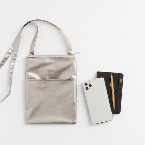 シャンパンゴールドを思わせる柔らかく上品なシルバーで、さりげないアクセサリーのようにお使いいただけそうです。合成皮革製のため汚れても拭いてきれいに保て、メンテナンスが簡単なのもうれしいポイントです。