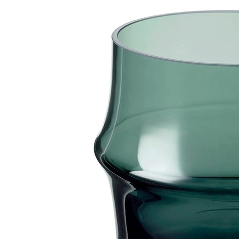 アーチ状のシルエットが上下にシンメトリーに連続するデザイン。落ち着いたダークグリーンと爽やかなライトブルーのカラーリングは、植物やインテリアにも良く馴染みます。吹きガラスで表現されるシルエットは、活けられた生花やグリーンの美しさと一体になり、その自然の美しさをさらに引き立たせるようです。