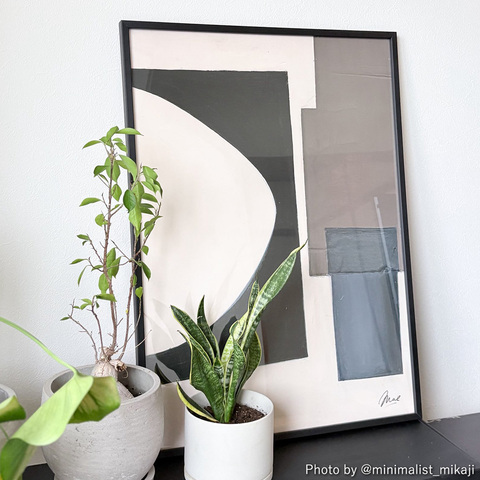 幾何学的なフォルムの構成的な相互作用と落ち着いた色調が、月夜の神秘と静けさを暗示する。涼しげなネオトラルとブルーのハンドペイントで描かれた構図は、心を落ち着かせる存在感を放っている。
