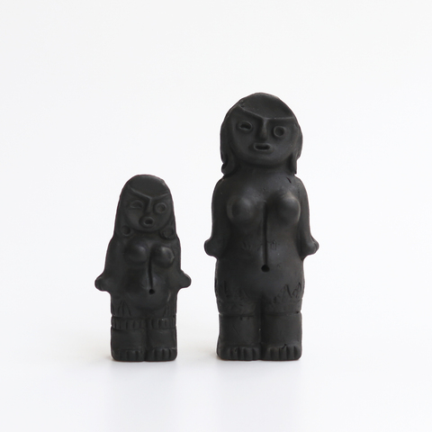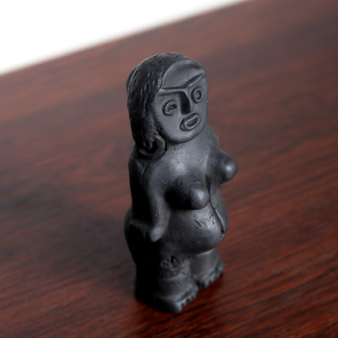 本来の土偶は黒っぽいものや薄茶、濃茶などさまざまな色をしていますが、本品は焼き上げる際に燻し、炭素を吸着させることで黒色に統一。