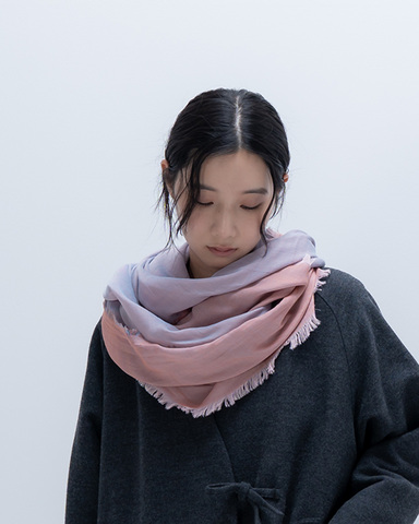 こちらの「サンライズ」は何色とも表現しがたい朝焼けの色を表現しました。ブルーと橙色のよこ糸を交互に織り込み、全体的には淡いラベンダーの様に見えますが、裏側は美しい桃色となっています。シャンブレーの美しさと、とろける様な肌触りがhatsutokiらしい一枚です。