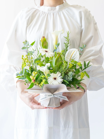 1点1点旬のお花をメイン花材とし、そのお花に合った色味の花材やフレッシュな葉物を組み合わせてご提案します。目ではわからない、届いた時に感じる新鮮なお花の香りもお楽しみのひとつです。 器が付いた状態ですので、届いてすぐに飾って楽しんでいただけます。