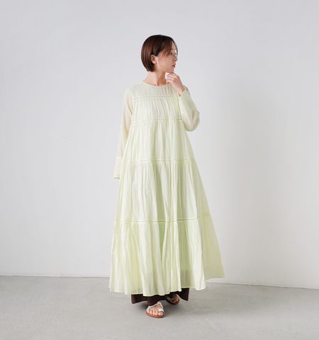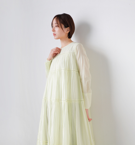 生地を贅沢に使いながらも、すっきりと着こなせるようボリュームをコントロールしたティアードドレスは、ロマンティックになり過ぎない大人なフェミニンムード。身に纏うだけで歩くのが楽しくなるような一枚です。ラダーレースで切り替える事で、単調にならずリッチな印象もプラスしてくれています。