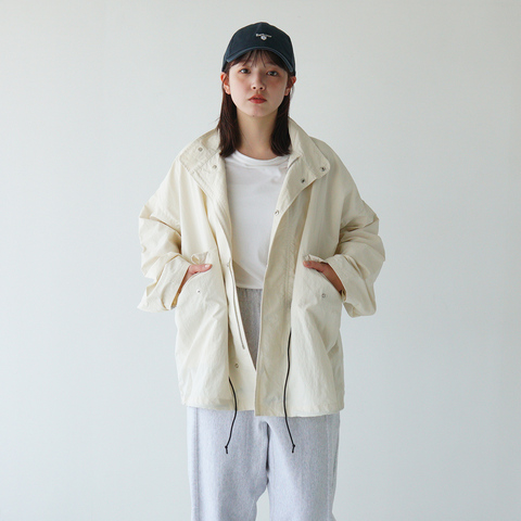 リラックスフィットのシルエットは重ね着しやすく、寒暖差のある季節にも対応。ワッシャー加工を施したナイロン素材が、ふんわりとした柔らかい風合いを生み出し、快適な着心地を提供します。