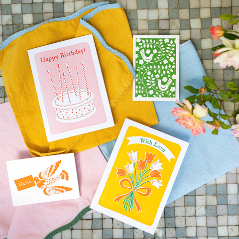 ろうそくを灯したお誕生日ケーキのパターンは、イギリスのデザイナーARIANA MARTINによるもの。活版印刷の凹凸も相まって、目にも美味しいカードです。