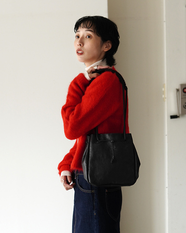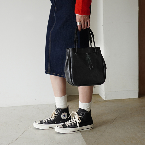 ネイティブカナディアンのカゴを思わせる編み込みディテールを落とし込み、ハンドル部分は漁師の結び方を応用。長さを自在に変えられる仕様で、ショルダーとしてもハンドでも楽しめます。