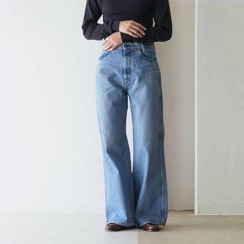 極限まで脚が長く見えるデニムニューフェイスです。ヨークを排除し、ポケット位置を上げることでヒップアップを演出。膝で絞られたセミワイドフレアが脚をすらりと長く見せます。