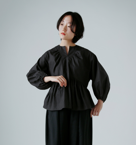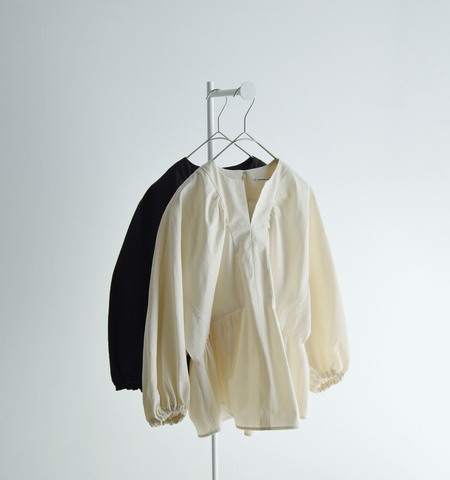 また、2枚袖仕立てのためバルーンスリーブをより立体的で特徴的なシルエットに仕立ててあります。肩切り替えがないので、女性らしい曲線を描いたショルダーからたっぷりとボリュームを持たせた袖へと続く、優雅なラインもこのお洋服の特徴のひとつです。