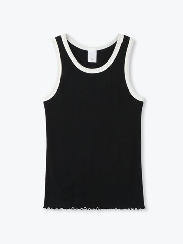 レイヤードしたときのアクセントになるよう、裾はメローフリルに。シックなバイカラーが大人かわいいトップスです。