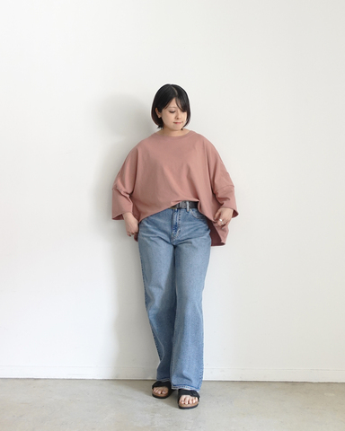 ドロップショルダーで着やすいワイドシルエット、どんなボトムスとも合わせやすい着丈感のTシャツです。