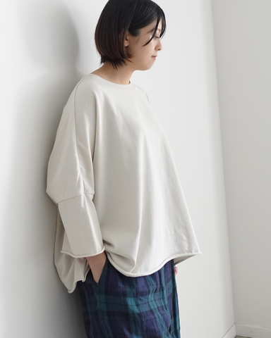 素材感がよく映えるナチュラル。様々なトーンに馴染むカラーコーデしやすい生成色のカットソー。同系色のホワイトや生成、ベージュでまとめたワントーンコーデにも映えます。