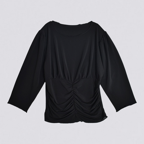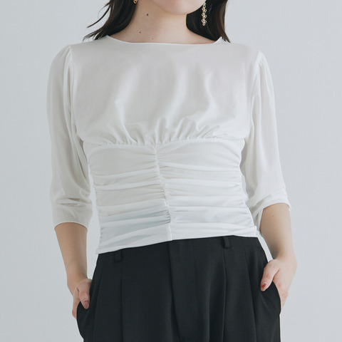しっとりとした素材の落ち感は、ギャザーデザインとの相性が良く、程よいフィット感でボディラインを拾いすぎず、着やせ効果も期待できます。