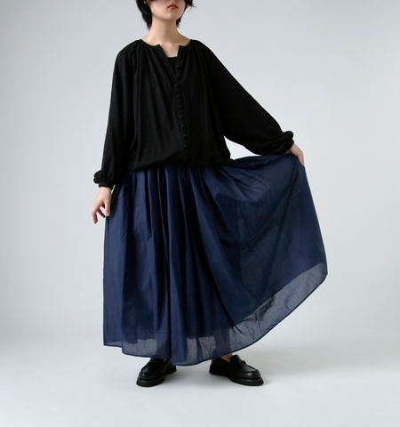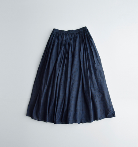 手仕事によるディテールとプリント使いがmaison de soilらしいデザインとなったロングスカートです。深みのある発色と軽やかな生地感、そしてドット模様によるさり気ない可愛らしさを添えたシックで大人可愛い1枚です。