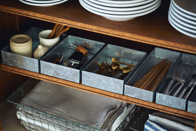 カトラリーボックスは浅型の長方形。ナイフやフォークだけでなくお箸もきれいに納まるサイズです。テーブルの上にそのまま置いてもいいですし、 引き出しの中に並べて、カトラリーを種類ごとに収納しておくのにも便利です。