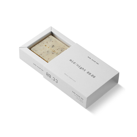 スペイン・バルセロナを拠点としたナチュラルスキンケアブランド、mid/night 00.00(ミッドナイト)のボディスクラブバーです。