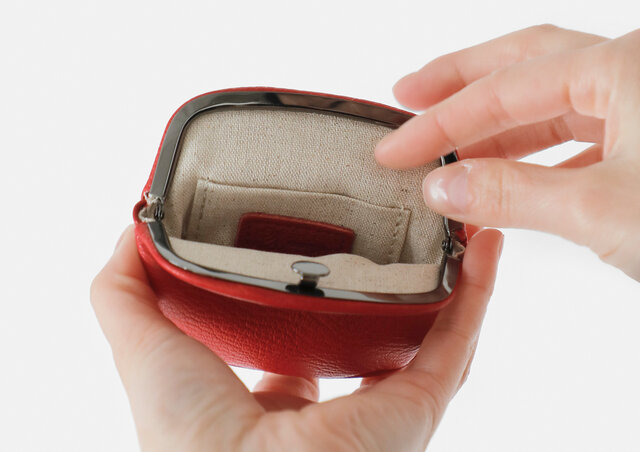 開口部は変形ガマ口。突起部分がなくスマートな形。ワンタッチでぱちんと開け閉めが出来る。