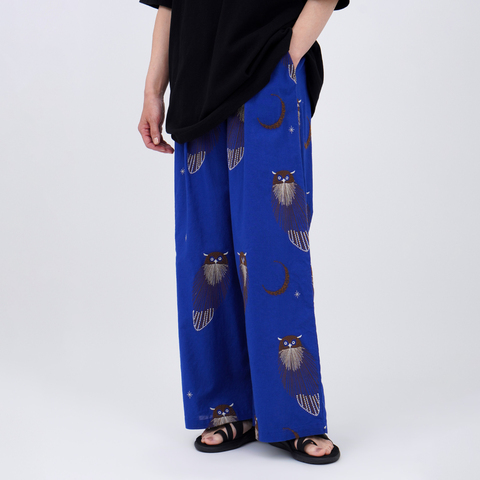 沖縄の夜の森をイメージしたテキスタイルには、ふくろう、月、星々といった神秘的なモチーフが散りばめられています。