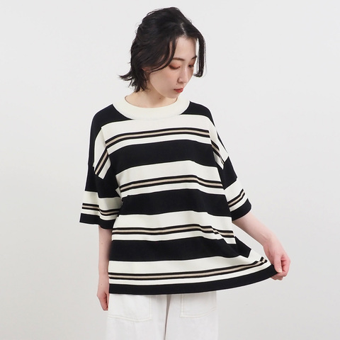 ベーシックながら目を引く太ピッチのボーダー柄が特徴のスノーコットン マルチボーダーワイドニットです。ニットならではのやわらかさと、ほどよい厚みの編地が心地よく、肌に優しくなじみます。カットソーとは異なる上質な表情があり、ラフになりすぎず、きれいめな印象をキープできるのも魅力です。