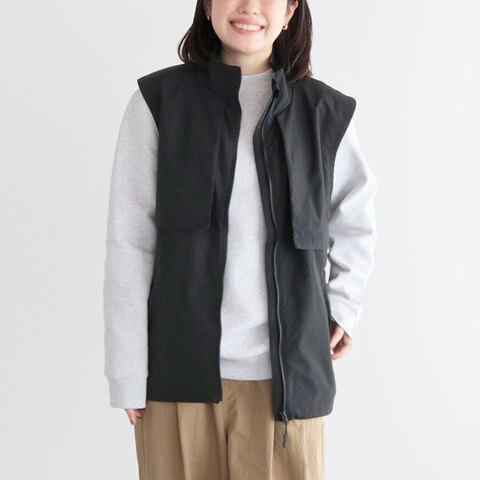 スウェットなど厚手のトップスの上からでも着用しやすいややゆったりとしたサイズ感。生地が薄手なので重ね着してもボリューム感が出すぎず、スッキリとした印象で着用いただけますよ。左側の裾に配されたドローコードでフィット感を自由に調節でき、シルエットの変化も楽しんでいただけます。