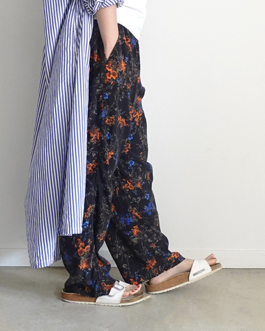 これからの軽やかなスタイルにも凛と映えるブラックフラワー、動くたびに上品になびくリラックスパンツです。