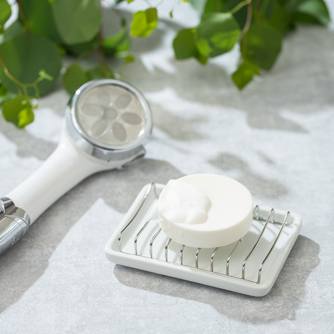 「真空加圧製法」でつくられた高密度の塩石けんは、湿度の高い浴室でも溶けにくく、長くお使いいただけます。