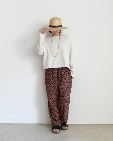 落ち着いた渋みのなかに明るさもあるブラウンベース × ブラックのレオパード。重い印象にはならずシーズン通して着れるカラートーンです。