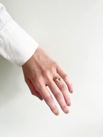 肌馴染みの良いナチュラルピーチの淡水パールをお花のように見立て贅沢に使用したリングです。
