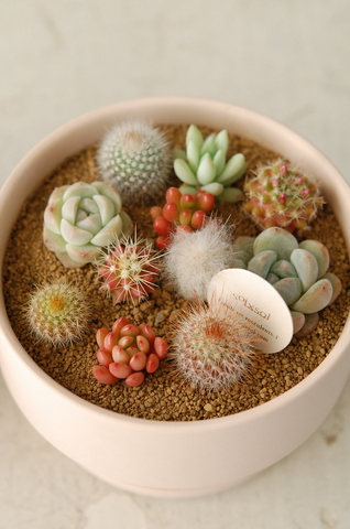 鉢はマットな陶器鉢です。優しい桜色のピンク、植物の内容を2種類からお選びください。