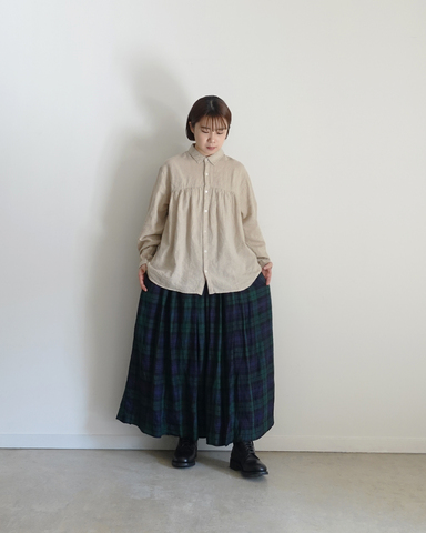 ヨーク部分から広がるギャザーシルエットが綺麗なリネンコットンブラウス。リネンとコットンをミックスさせて織り上げられた軽やかな着心地の生地感。