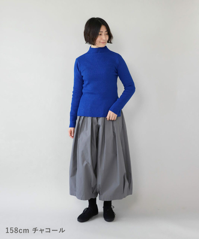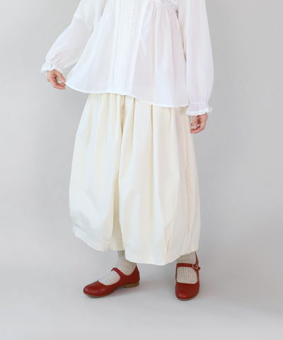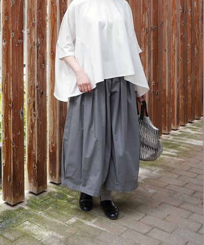 ゆったりとしたバルーンシルエットに、太めのウエスト帯と裾のタックがメリハリを効かせています。