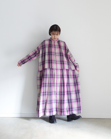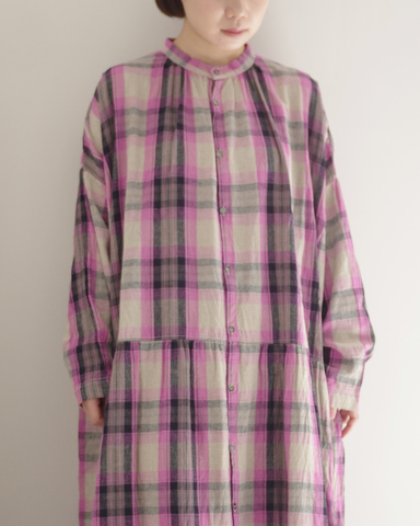 ヴィンテージ感あるベージュのリネンをベースに紫がかったピンクと、インディゴのラインが織り込まれたチェック柄の2カラー。