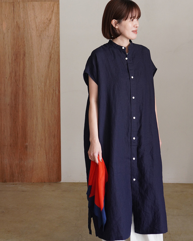 軽やかな風をまとったような、涼やかな着こなしが楽しめるシャツワンピース。首元をすっきりと見せるバンドカラーと、肩まわりをやさしく覆うフレンチスリーブが上品な抜け感を演出します。