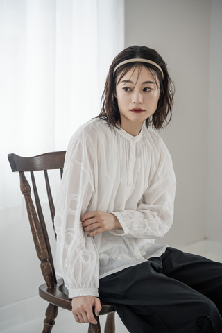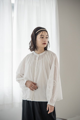 たっぷりと施されたギャザーと、印象的な刺繍モチーフが目を惹く、大人の遊び心を感じさせる一枚。