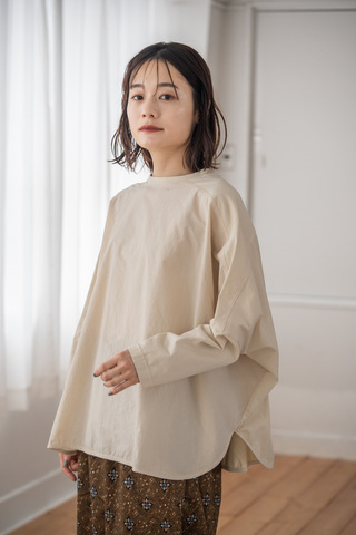 ゆったりとしたドルマンシルエットでありながら、肩に斜めに施されたヨーク切替が視線を引き締め、全体のシルエットをすっきりと見せてくれるのが魅力。