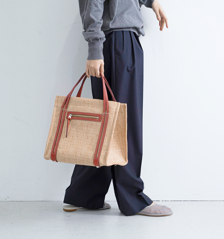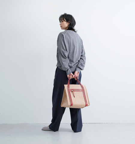 上質かつ品の良さを後押ししてくれる、牛革のハンドルとトリミング。女性の手でも持ちやすいよう、二股にくり抜き細く仕上げたハンドルも特徴です。牛革の丁寧なトリミングと、細やかなステッチに、つくりの良さを感じます。