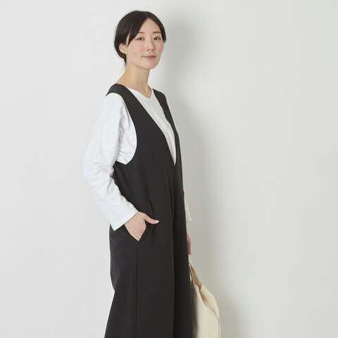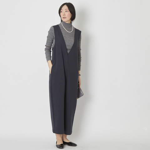 冬はウール、夏はリネン混の生地と、シーズンに合わせてサロペット作っているところは多いですが、こちらは綿の混率が高い生地なので、一年を通して着られるのがいいところ。真夏と真冬に着るには、インナーを調整する必要はありますが、季節によって買い替える必要が無く、これ一枚で一年中着られる手軽さは他には無いなと思います。