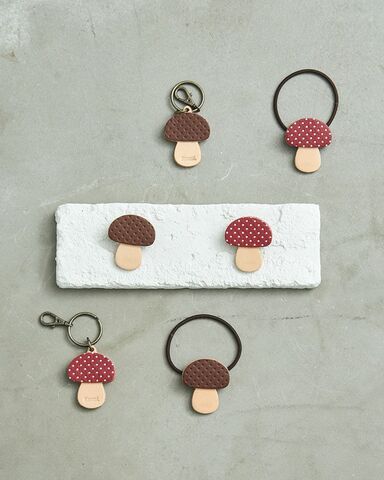 きのこ好きさんにおすすめなのは、レッドとブラウンの2色持ち。キーリング、ヘアゴム、ブローチがあるので、ペアにして「きのこ」コーデを楽しんで。おうちの鍵はレッドきのこキーリングに、ニットの胸元にはブラウンきのこのブローチのように、小物とファッションに取り入れると、ますます心が踊ります。