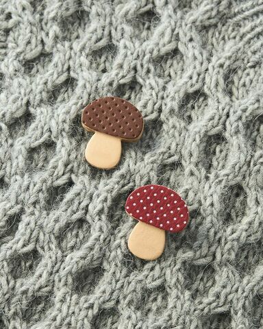 ふわっと巻いたストールにママはブラウン、お子さんはレッドのブローチを。色違いでつければ、きのこ親子のできあがり。セーターやコートの襟元、ベレー帽やニット帽など、お好きな場所にプラスすれば、コーデのアクセントに。きのこブローチと一緒に、公園や森へお出かけしたら、いつもよりも自然と仲良くなれるかも。