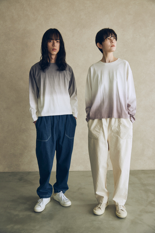 今季のテーマの宵闇にちなんだグラデーション染め加工を施した長袖カットソーです。夕焼けの色と夜の入り口の色をエモーショナルに、且つ着こなしやすさににもこだわったシンプルデザインのトップスです。