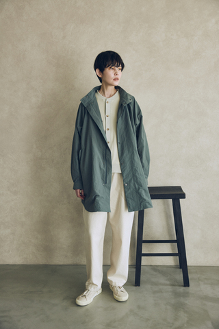 微撥水加工されたナイロン生地のポンチョ風デザインコートは例年よりも少しコンパクトにリサイズし、着まわし易くなりました。