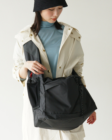 ドローコード仕様のフラップでバッグの開口部を絞ることができ、中身をしっかり目隠しできるデザインがポイント。耐久性・耐水性に優れた高機能素材を採用し、軽やかでありながらタフな仕上がりです。