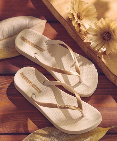 やわらかなベージュに、上品なゴールドのトング。シンプルなデザインなのに華やかで、足元に彩りを添えてくれます。
