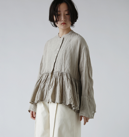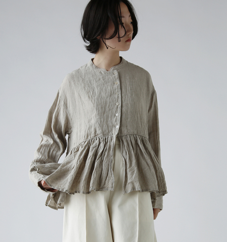 変形の前立てやギャザー使いが特徴的なシャツジャケットです。ペプラムにはギャザーを寄せてボリュームを持たせて、様々なシルエットのボトムと相性の良い1枚に仕立てられています。