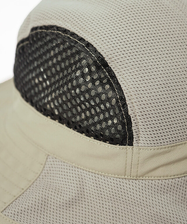 ・サイドにはメッシュベンチレーション、頭頂部にはダブルラッセルメッシュ生地を配置した高い通気性でムレを逃がし、ハット内をドライにキープします。