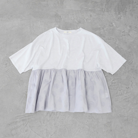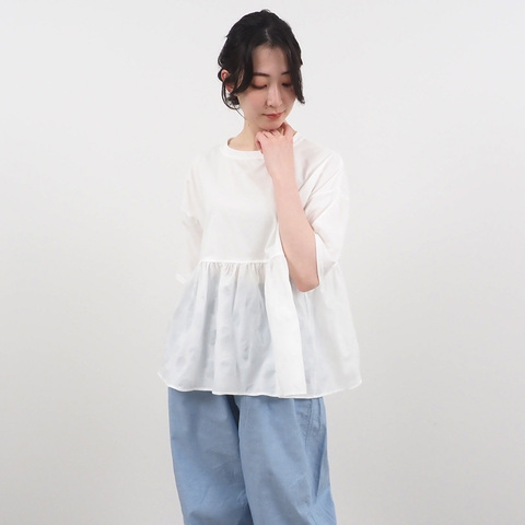 下身頃:生地はふんわりと軽くサラッとした着心地が特徴の素材に、凸凹感を出す加工をし、肌離れが良く暑い時期でも快適に着用いただけるように仕立てました。またドットのシャドープリントはいつものプリントとは違った風合いをお楽しみいただけます。