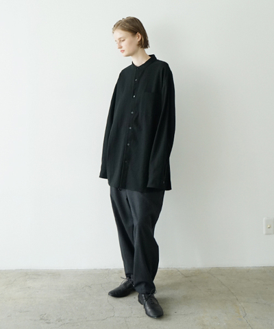WOOL100% 梳毛糸を使用した生地です。上質な原料により、なめらかな肌触りと程よい光沢が感じられます。丁寧に縮絨工程を行い圧縮フラノ仕上げにすることで適度な弾力性も持ち合わせています。毛織物の名産地、愛知県尾州地方の老舗ウール工場でオリジナルで制作してもらいました。
