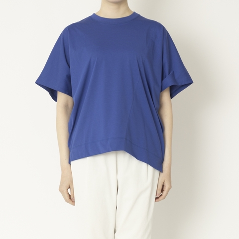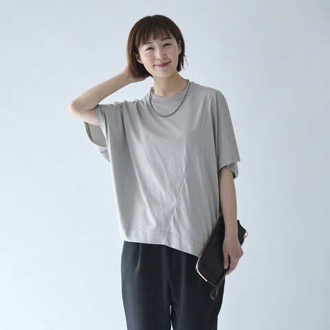光沢感があり、接触冷感効果のある生地を使用。シンプルなドルマンスリーブをベースに、切り替えを入れることによってすっきり見え効果を高めた、着心地も見た目も満足できる、猛暑に負けない1枚ができました。